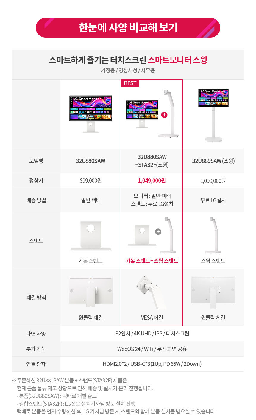 LG 스마트모니터 스윙 32U880SAW + STA32F 80cm 4K UHD IPS 터치스크린 OTT USB-C 이동형스탠드