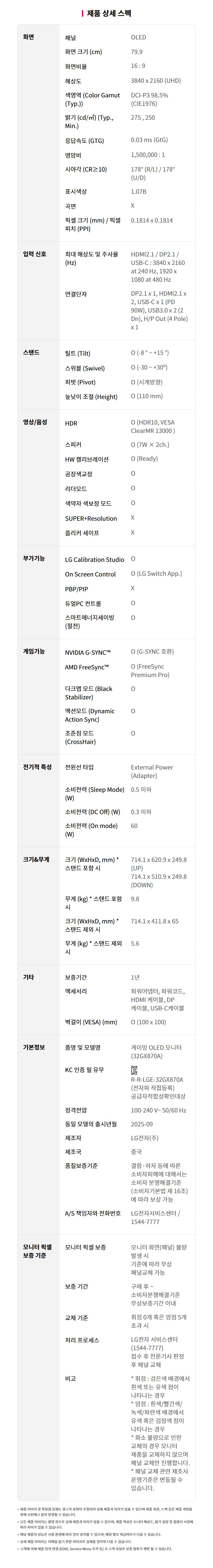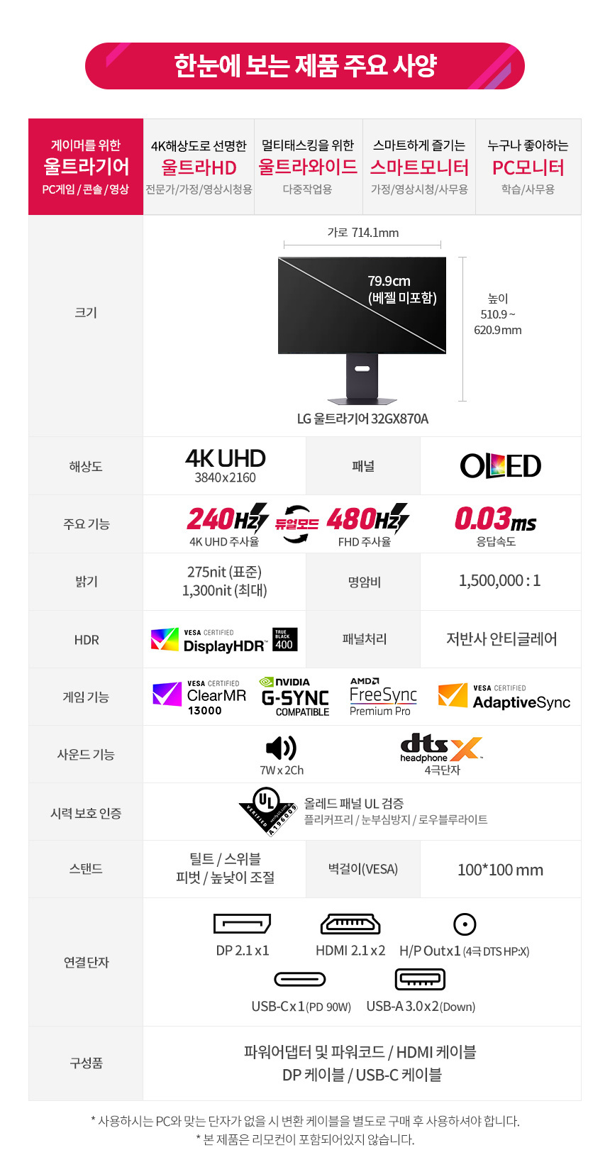 LG 울트라기어 32GX870A OLED 4K 240Hz FHD 480Hz 0.03ms USB-PD 게이밍모니터